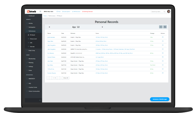 btwb automatically pulls in previous results for programmed workouts so that members can show up to class prepared and ready to PR. Movement history and movement demos are also always available.