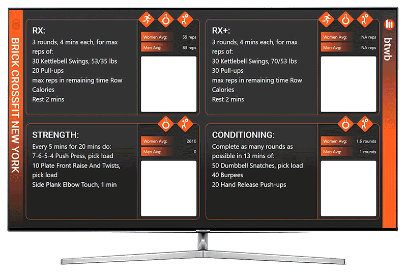 Select from 5 different screen options from showcasing your gym's WODs to displaying newly set personal records. You can even replace your whiteboard with a virtual leaderboard.